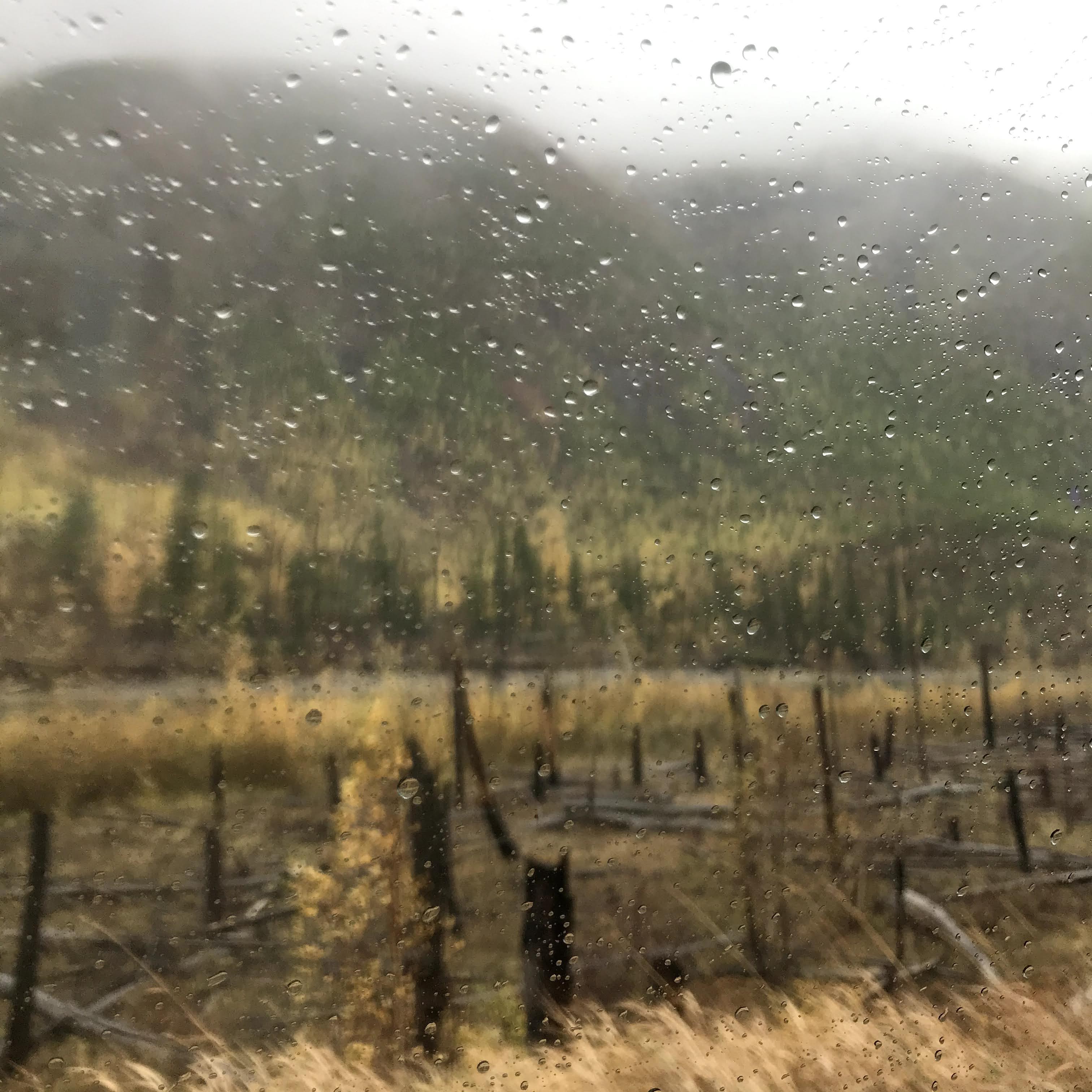 view through a rainy window of pines, larches, and trees that had been burned in a forest fire.