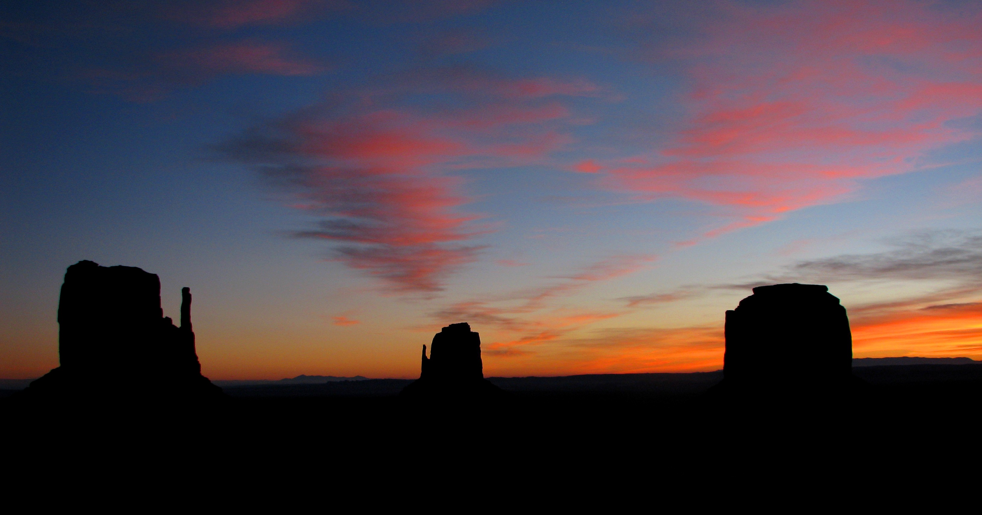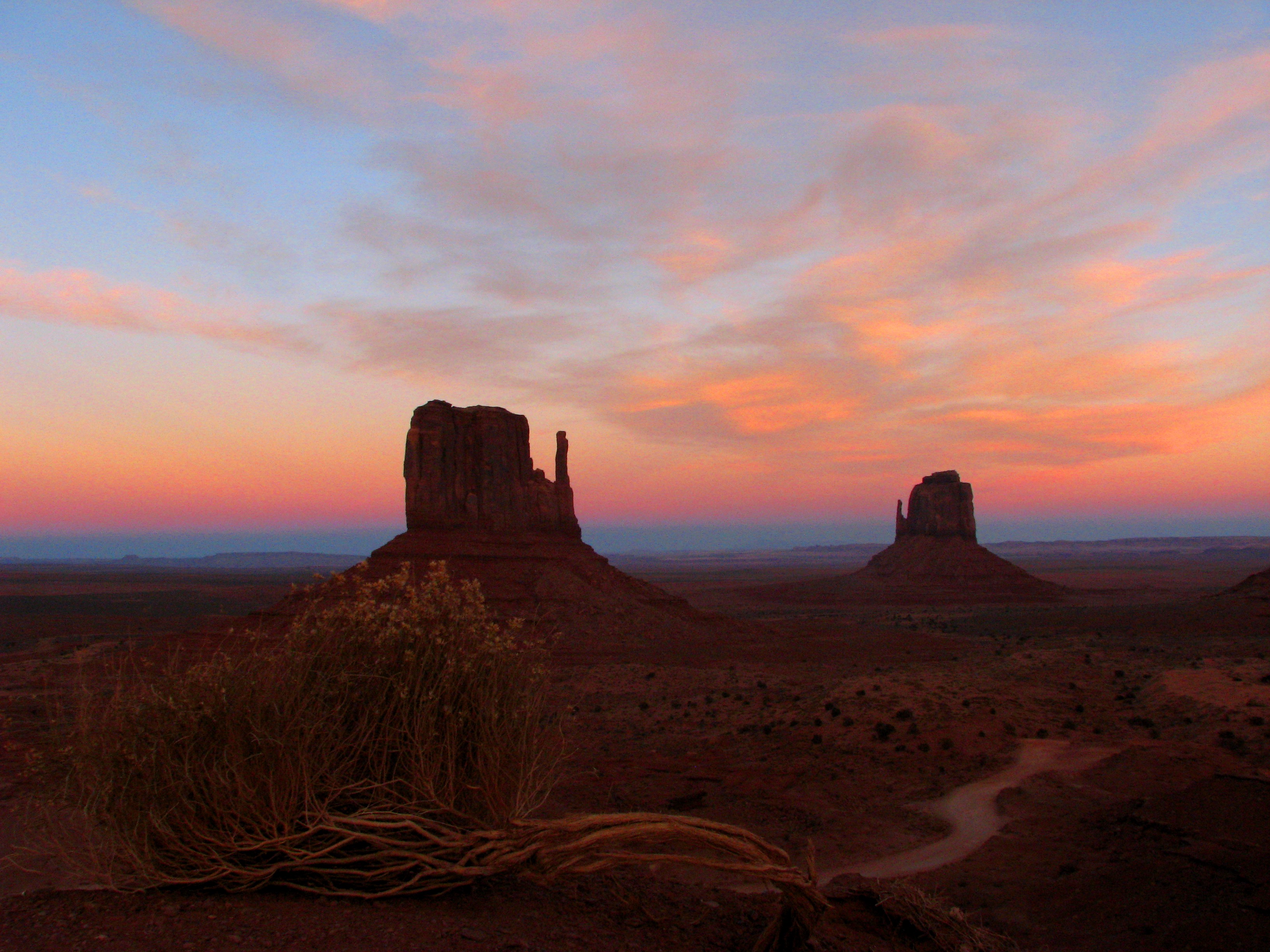 There is light now on the horizon, bringing the Mittens into dark profile. A grayish burnt orange that fades gradually into blue that gets darker and darker to merge into the stary night, the transition. There are charcoal smears of clouds, like the artist rubbed the sky with a dirty hand, smearing part of the dark outline of rock into the new start of day.