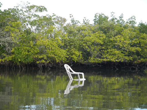 Someone had anchored this plastic chair in the middle of the mangroves, probably to sit in while they fished. The water is only a few feet deep, and the chair is sunk into the muck.