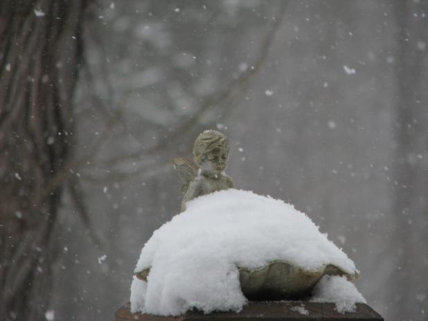 The face turns. Eyes flicker, remain closed. Warm socks, hot tea. All still, save the feathers, the snow. Heat inside, cold out. Soothing breath, calm, peaceful. Dark lashes, like feathers, on a lighter face. Deep footprints, shallower, filling imperceptibly. Cold magic. Large hands folded, resting. The snow piles higher. Red, blue, brown jostle for space. Chickadees are polite, waiting their turn. Cardinals come and go as they please, leaving the others to their mess. The snow falls sideways. It sticks to the side of buildings.