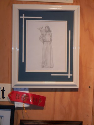 After the antiques, we made our way into the barn with the art. I like to think that, with as many artists in our family as we have, I have a fair idea of what constitutes “good” art. I realize that art is very subjective, but still. The painting of Jesus with various grenade-launchers and machine guns, made to look like a violent movie/video game cover, not good art. Also just plain bizarre. Most of the other art had more traditional subject matters, (like the one of Truffula trees made by an elementary-schooler) and was much more pleasurable to view.