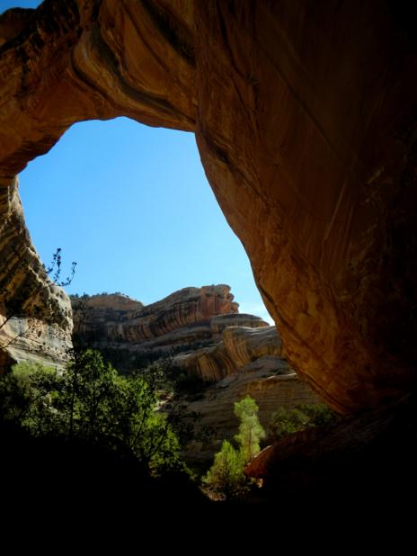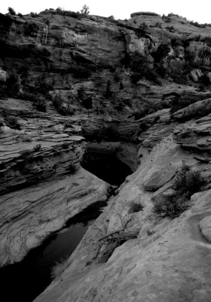 I am sitting in Natural Bridges National Monument, at Owachomo Natural Bridge, the last of three natural bridges in the Monument. It is after dark, and I’m waiting for the stars and my friend Max, who is photographing the night sky. In the distance, from their pools in the narrow rock canyon, I hear frogs that sound like sheep and chickens. Bats fly about in quick loops, swerving through the dusk.